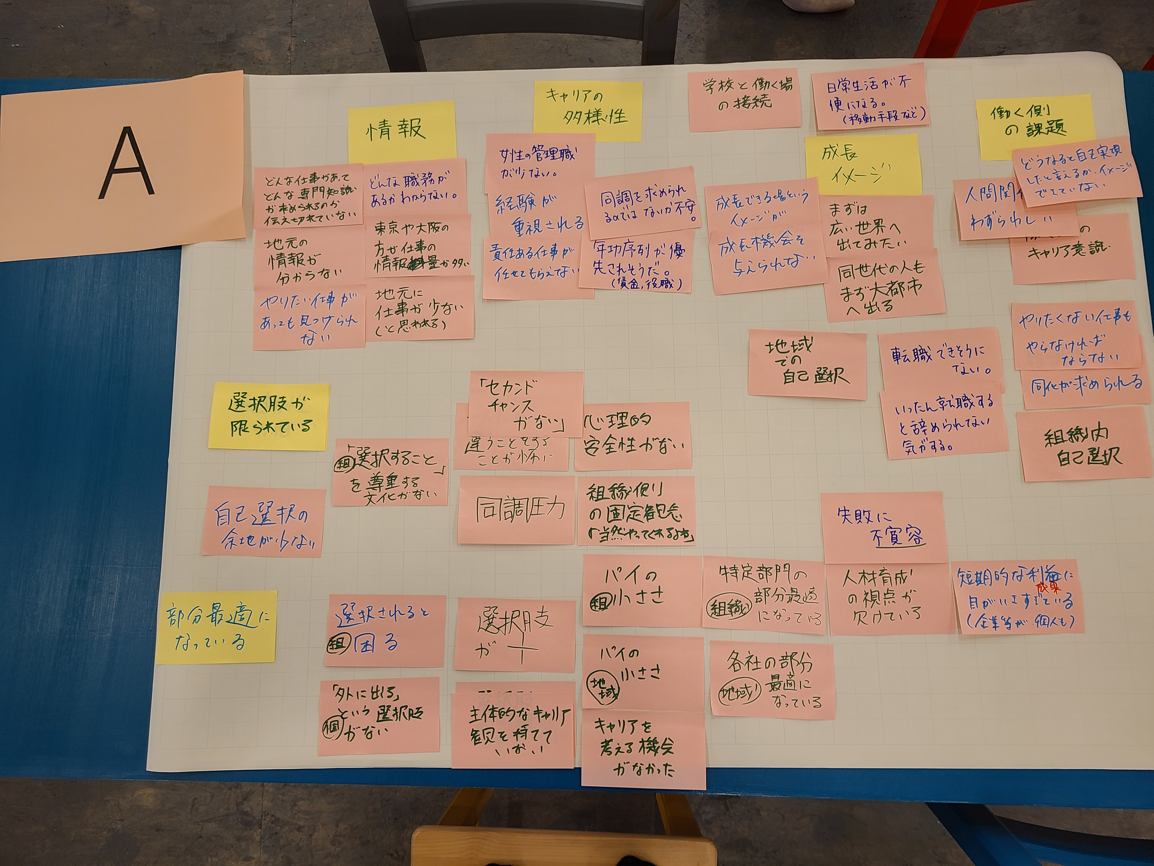はじめにグループ内で目指す理想の姿を「多様性を尊重されて、誰もが静岡に暮らし働き続けたいと思えている」とし、人口流出が止まらない現状とのギャップが起こる要因を働く場に絞って議論し、続くワールドカフェで参加者間の交流と意見交換を行いました。
