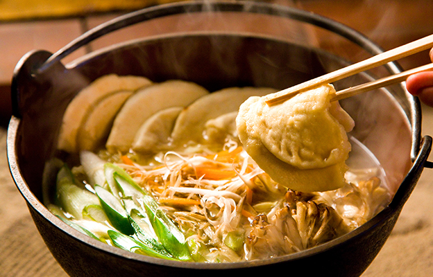 小麦粉をこねて薄く伸ばしたものを手でちぎり、お鍋の中で季節の野菜とともにだしで煮込む料理。具やだしは季節によって様々あり、川魚や川のカニ、鶏肉、きのこなどを用います。